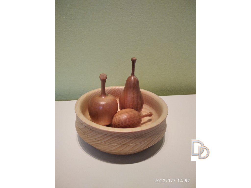 Jemná, ručně dělaná, dekorace z kvalitního tvrdého dřeva, která je vhodná pro běžný dekor nejen kuchyňského stolu. Souprava se skládá z 1 ks hrušky, 1 ks jablka, 1 ks švestky, které jsou naaranžované v misce podobného dekoru.